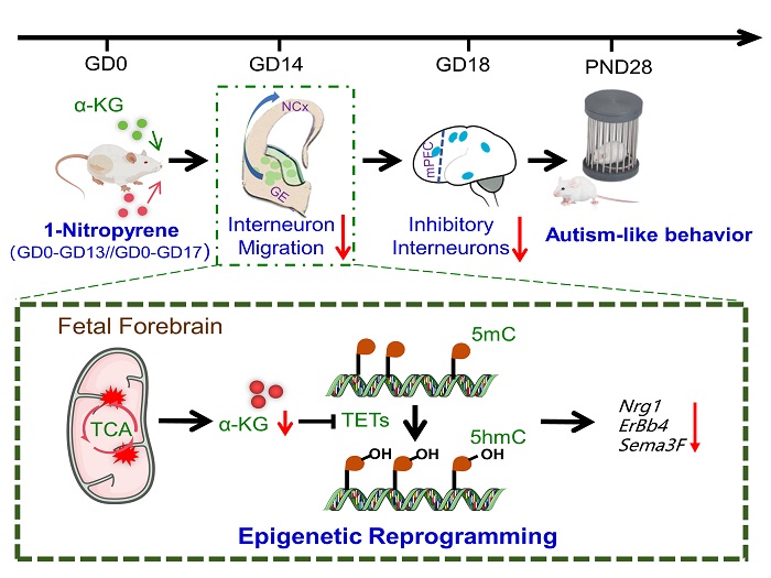 自闭症谱系障碍是以刻板行为和社交障碍为主要特征的儿童神经发育障碍性疾病,越来越多研究发现产前不良环境暴露是儿童自闭症谱系障碍患病率持续升高的主要原因。硝基多环芳烃是大气细颗粒物关键组分。徐德祥教授团队研究发现,孕期暴露硝基多环芳烃引起子代自闭症样行为障碍;机制性探索发现,孕期暴露硝基多环芳烃改变神经元迁移基因DNA羟甲基化重编程并延缓胎脑中间神经元从神经节隆起向前脑皮层的切向迁移;孕期补充α酮戊二酸能改善神经元迁移基因DNA羟甲基化重编程并减轻硝基多环芳烃所致自闭症样行为障碍。该研究成果为揭示发育源性疾病的环境病因机制并有效预防孕期暴露空气污染物诱发自闭症谱系障碍提供理论支撑。