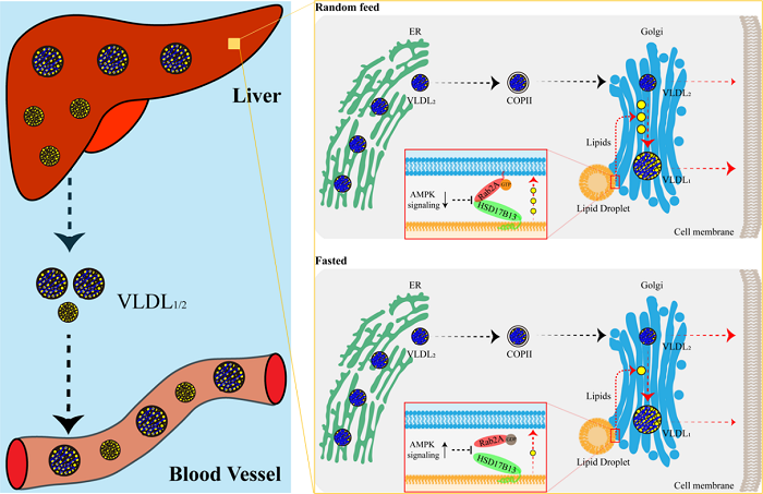 该项研究发现,肝实质细胞中高尔基体(Golgi apparatus)定位的Rab2A蛋白可以与脂滴(Lipid droplet)定位的HSD17B13蛋白部分结合,进而介导脂滴-高尔基体之间的互作,促进脂质(Lipids)从脂滴转运至高尔基体,最后提高肝细胞内极低密度脂蛋白(very-low-density lipoprotein, VLDL)的脂化成熟和分泌。同时,相关研究结果进一步提示,靶向抑制该调控通路可以显著降低血液中甘油三酯和胆固醇的水平。