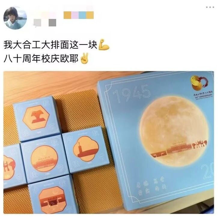合肥工业大学今年的中秋福利,因为80周年校庆更添仪式感。学校首先送上“免费惊喜”——蓝色包装的月饼礼盒,一盒装5枚,包装上醒目的“建校80周年”字样,搭配巧妙融入的校庆校徽、校训和校园建筑元素,拿在手里就像一份迷你“校园文化手账”。