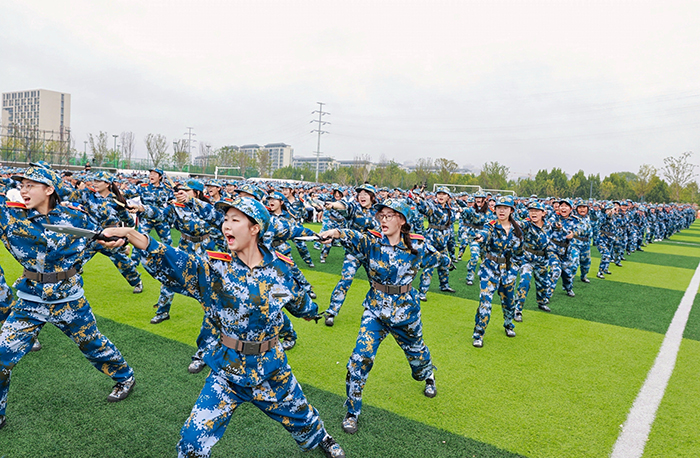 无军训、不成才,无迷彩、不青春。军训成果汇演中,2025级本科新生和承训单位的教官,以刚劲如松的军体拳、霸气凌厉的匕首操、气吞山河的刺刀操表演,充分展示了两周军训时间里磨炼意志、强健体魄的丰硕成果,更彰显了新时代青年顽强拼搏、昂扬向上的精神风貌。