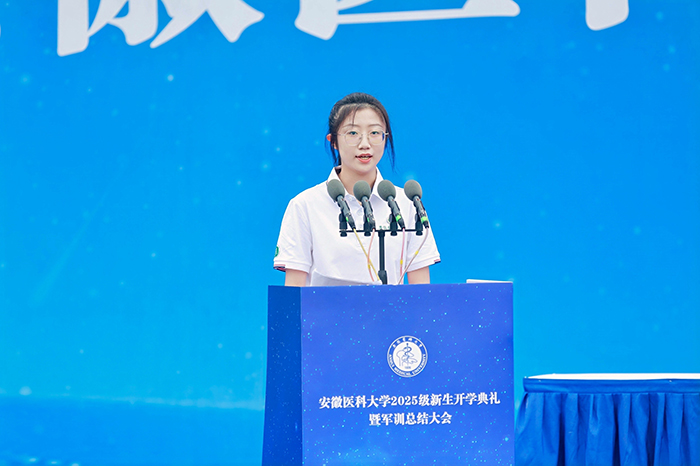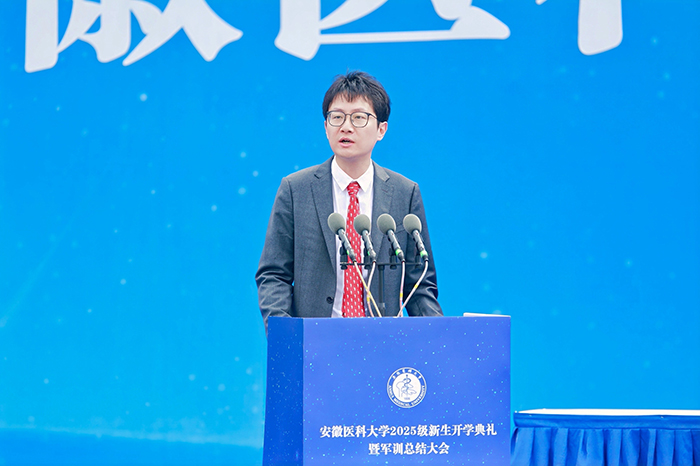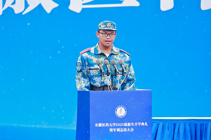 2025级临床医学“5+3”一体化专业缪杜亦军作为本科新生代表发言。他结合自己对校歌、校训的感悟,谈到了学医初心以及未来在医学道路上求索的坚定决心,希望与全体新“安医人”携手,书写属于青年一代“医路生花”的精彩篇章。