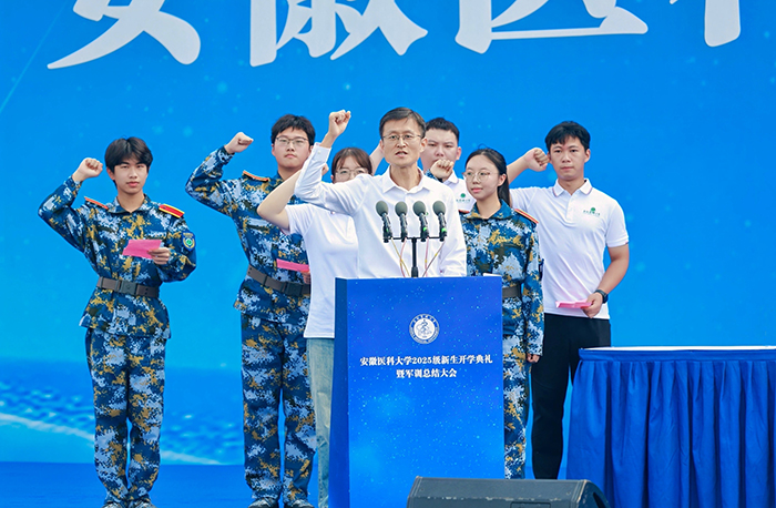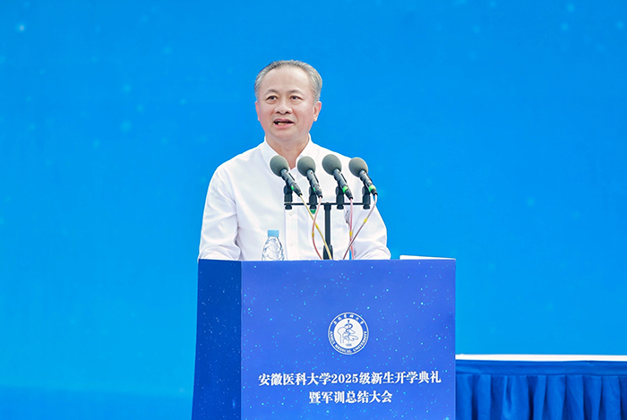 校长翁建平作了题为《以微小启程 以伟大收官》的主题演讲,代表学校向来自五湖四海的新同学表示最热烈的欢迎,并将学校近一个世纪的厚重历史以及发展历程中凝练的校训精神、铸就的百年安医精神娓娓道来。他表示,“为学须先立志”,全体2025级新生接过的不仅是录取通知书,更是一份精神的传承和信念的延续。