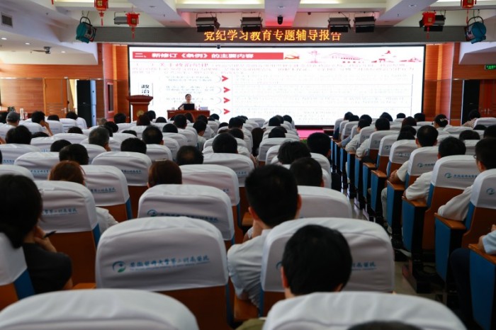 6月27日下午,校纪委书记、省监委驻校监察专员黄新美到第二附属医院,作题为《学习贯彻〈中国共产党纪律处分条例〉》(以下简称《条例》)的党纪学习教育专题辅导报告。